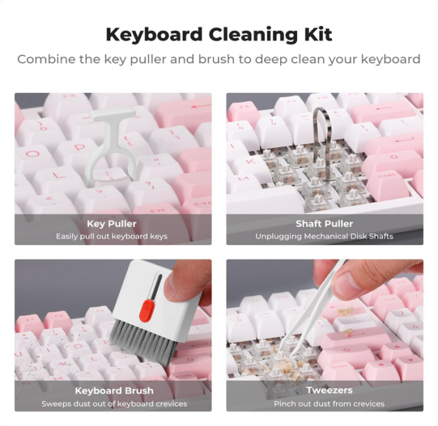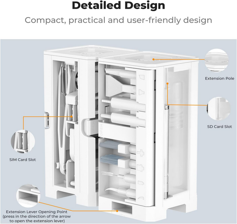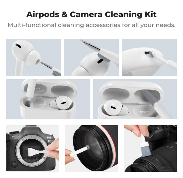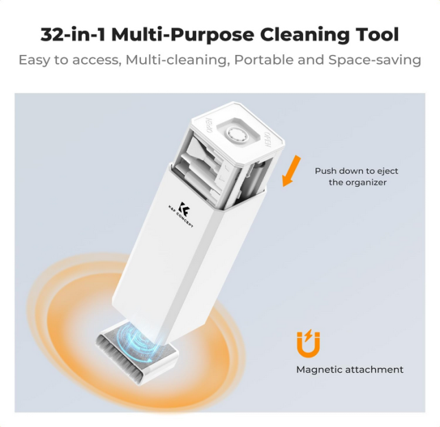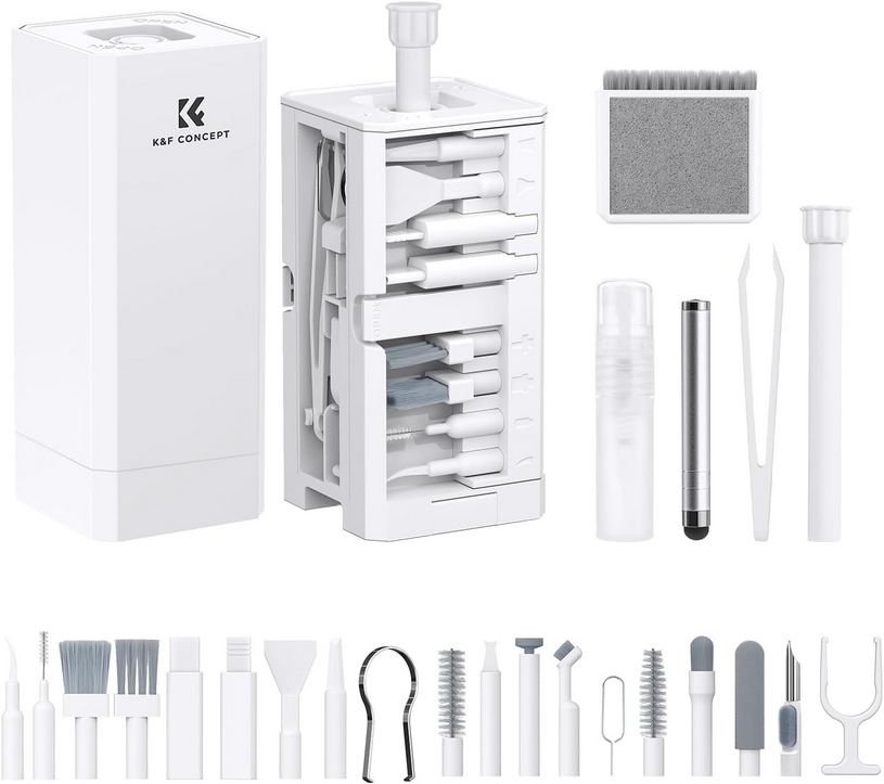 Vyčistite každý kútik a zákutok svojich technických zariadení pomocou súpravy na čistenie klávesníc K&F Concept 32 v 1, univerzálneho riešenia všetko v jednom, navrhnutého na bezproblémovú údržbu klávesníc, smartfónov, slúchadiel, notebookov a ďalších zariadení. Táto kompaktná sada obsahuje ako hlavný prvok veľkú vysúvaciu kefu, doplnenú o špecializované nástroje, ako sú šikmé špičky na nabíjacie porty a reproduktory, silikónové čistiace prostriedky na porty Lightning a USB-C, vyhadzovač SIM kariet a stylus na presnú interakciu s obrazovkou. Odstráňte odolné nečistoty zo slúchadiel pomocou obojstranného čistiaceho pera (kovová špička na odolné škvrny, mini kefa na sieťky), okrúhlej špongie na vnútorné časti nabíjacieho puzdra a mäkkých kefiek na odstraňovanie prachu – všetko vylepšené vysúvacou rukoväťou pre ťažko dostupné miesta. V prípade klávesníc kefa s vysokou hustotou odstraňuje prach z povrchu, zatiaľ čo nástroje na vyberanie klávesov a prepínačov umožňujú jednoduchú demontáž mechanických konfigurácií; pre dôkladné hlboké čistenie pridajte kefu s tvrdými štetinami a pinzetu. 5 ml fľaša s rozprašovačom (prázdna, pripravená na váš roztok) sa kombinuje s vláknovými utierkami na odstránenie odtlačkov prstov a mastnoty z obrazoviek telefónov, tabletov alebo monitorov. Ergonomické telo slúži zároveň ako bezpečné úložisko pre SD/SIM karty, vďaka čomu je všetko prehľadné a prenosné. Táto súprava je určená na každodenné použitie na malých elektronických zariadeniach a zaručuje výsledky bez šmúh a poškodenia vďaka odolným integrovaným nástrojom, ktoré zvládnu akúkoľvek úlohu v oblasti čistenia.