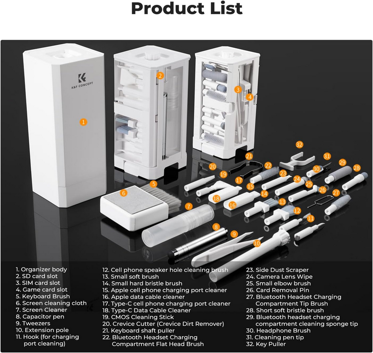 Súprava na čistenie klávesníc K&F Concept 32 v 1: Komplexná súprava vysúvateľných kefiek na klávesnice, telefóny, slúchadlá a elektroniku – obsahuje čističe portov, nástroje na odstraňovanie klávesov, utierky z mikrovlákna a ďalšie pomôcky na jednoduché a dôkladné čistenie.