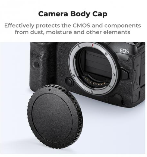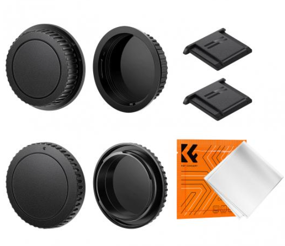 Súprava na ochranu bajonetu Canon EF od spoločnosti K&F Concept obsahuje 2 kryty tela, 2 zadné kryty objektívu, 2 kryty hotshoe a 1 čistiacu utierku z mikrovlákna pre fotoaparáty Canon EF (T7, T6, T5, T8i, T7i, 5D IV/III/II, 6D II/I, 90D, 80D). Je vyrobená z odolného ABS s pevným bajonetovým uchytením a čiernym povrchom a chráni senzory, objektívy a kontakty pred prachom, vlhkosťou a škrabancami – je ideálna na skladovanie a cestovanie.
