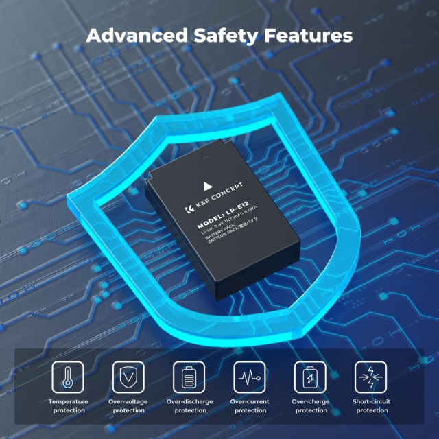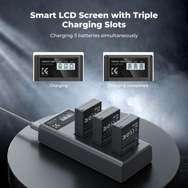 Súprava nabíjačky batérií LP-E12 obsahuje 3 ks batérií EOS M50 (s nominálnou kapacitou 1100 mAh, 7,4 V, 8,8 Wh) a nabíjačku s tromi slotmi a LCD displejom, ktorá zabezpečuje nepretržité napájanie pre dlhšie fotografovanie. Nabíjačka s tromi slotmi dokáže efektívne nabíjať 3 ks batérií EOS M50 súčasne a na LCD displeji je jasne zobrazený stav nabíjania každej batérie.