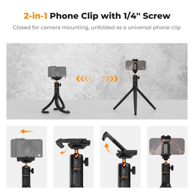 Výsuvný flexibilný statív K&F Concept MS29 ponúka všestrannú, stabilnú a prenosnú podporu pre smartfóny, fotoaparáty a akčné kamery. Vďaka ohýbateľným nohám, 360° otočnej guľovej hlave a konštrukcii 3 v 1 zaručuje maximálnu flexibilitu pri zachytávaní úžasných záberov na akomkoľvek povrchu.