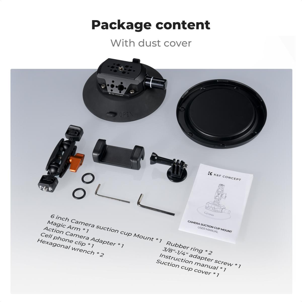 K&F Concept MS46 je univerzálny 6-palcový vákuový prísavný držiak určený na bezpečné upevnenie na hladké povrchy, ako sú sklá automobilov, dlaždice alebo drevené panely. Vďaka flexibilnému nastaveniu v rozsahu 360° a viacerým skrutkovým rozhraniam podporuje širokú škálu zariadení, vrátane fotoaparátov, držiakov mobilných telefónov a osvetľovacej techniky, čím poskytuje stabilné a prispôsobivé uhly snímania pre fotografovanie a videozáznamy.