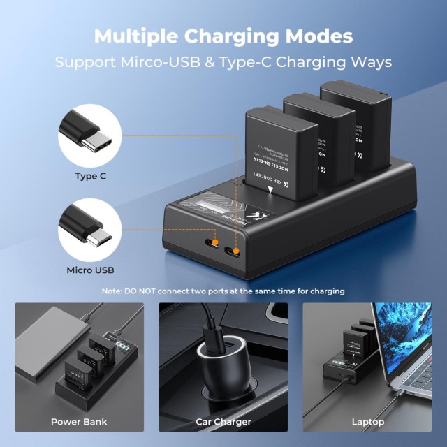 Súprava obsahuje 3-slotovú LCD nabíjačku batérií, ktorá umožňuje simultánne nabíjanie troch batérií a zároveň zobrazuje stav nabíjania každej z nich na prehľadnom LCD displeji. Nabíjačka podporuje duálny vstup cez Micro USB alebo Type-C (5 V/2,1 A), vďaka čomu je kompatibilná s nástennými adaptérmi, nabíjačkami do auta, notebookmi a inými zdrojmi napájania USB. Pri použití vstupu Type-C je možné všetky tri batérie úplne nabiť približne za 3,8 hodiny.