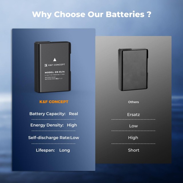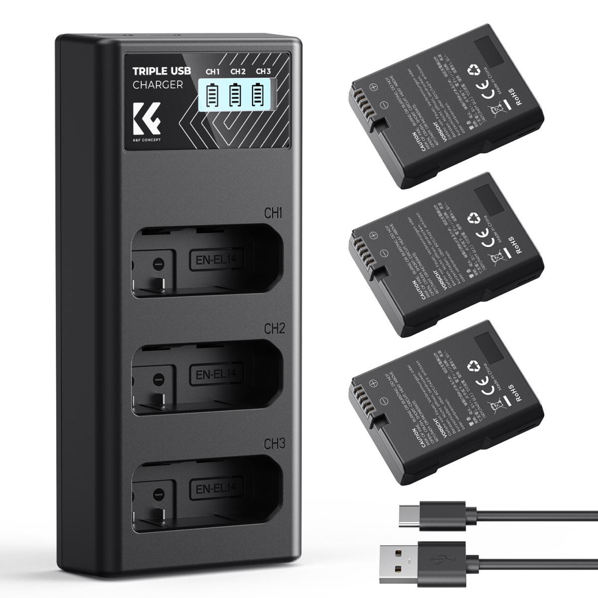 Súprava batérií K&F Concept Nikon EN-EL14 obsahuje 3 vysokokapacitné batérie EN-EL14/EN-EL14a s kapacitou 1050 mAh a napätím 7,4 V, ktoré poskytujú dlhotrvajúci výkon pre neprerušované fotografovanie s fotoaparátmi Nikon. Kompatibilné s modelmi vrátane D5600, D5500, D5300, D5200, D5100, D3500, D3400, D3300, D3200, D3100, Coolpix P7000/P7100/P7200/P7700/P7800 a ďalších zariadeniach napájaných batériami EN-EL14.