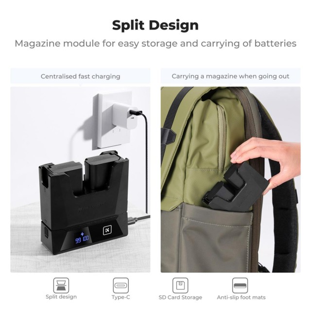 nabíjačka batérií NPFZ100 má odnímateľnú konštrukciu, vďaka ktorej možno priehradku na batérie ľahko vybrať a použiť ju ako prenosné puzdro na batérie. Vďaka ľahkej konštrukcii a malým rozmerom je ideálna na cestovanie a ponúka pohodlie bez toho, aby zaberala ďalšie miesto. Rozlúčte sa s pomalým nabíjaním! Táto nabíjačka NP-FZ100 s rýchlym nabíjaním 18 W PD zvyšuje rýchlosť až o 50 % pomocou 8,4 V 1,5 A pre jednu batériu a 1 A pre dve batérie, čím sa vaše batérie nabíjajú podstatne rýchlejšie ako tradičné nabíjačky. Napája dve batérie NP-FZ100 za takmer o 2 hodiny menej, takže môžete stráviť viac času fotografovaním a menej času čakaním.