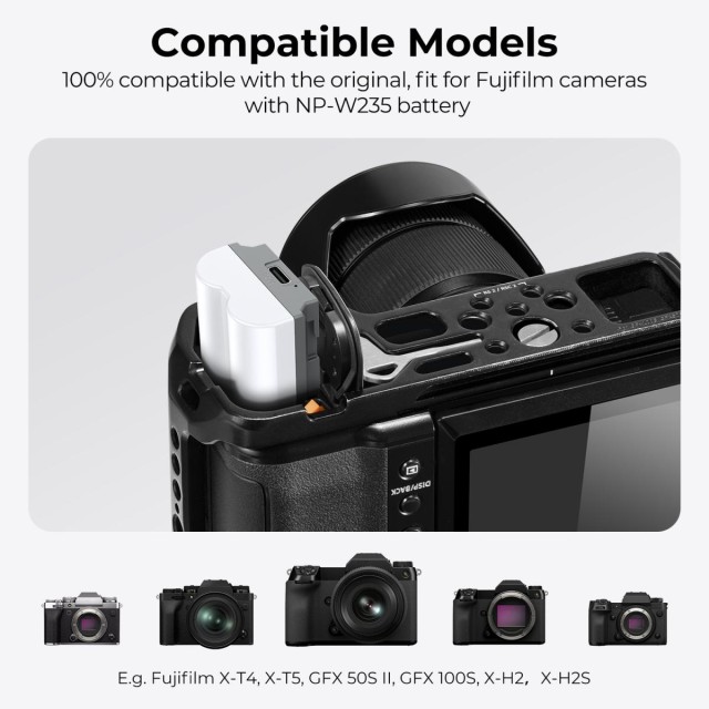 Náhradná batéria NP-W235 je dokonale kompatibilná s fotoaparátmi fujifilm X-T4, X-T5, GFX 50S II, GFX 100S, X-H2, X-H2S, s ochranou proti prepätiu, ochranou proti preťaženiu a ďalšími bezpečnostnými ochranami. Dodaný nabíjací port typu C možno priamo pripojiť k adaptéru na nabíjanie pomocou dodaného nabíjacieho kábla USB typu A na typ C, nie je potrebná externá nabíjačka, cestuje sa ľahko.
