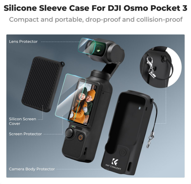Sada silikónových ochranných krytov K&F CONCEPT Pocket 3 je navrhnutá na optimálnu ochranu a funkčnosť a obsahuje odolný silikónový kryt tela, ochranný kryt obrazovky z tvrdeného skla odolného proti výbuchu a praktické funkcie proti strate príslušenstva fotoaparátu.