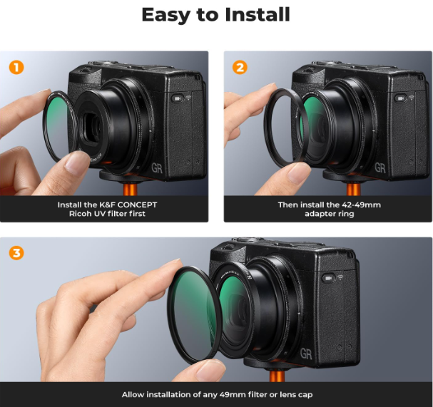 Súprava filtrov K&F Concept Black Diffusion 1/4 + MCUV Protection Filter Kit s adaptérom 42-49 mm je špeciálne navrhnutá kombinácia dvoch filtrov pre kompaktné fotoaparáty Ricoh GR IIIx, GR IIIx HDF, GR III, GR III HDF a GR II, ktorá spája nevyhnutnú ochranu proti UV žiareniu s filmovými efektmi čierneho rozptylu. Viacnásobne potiahnutý UV filter blokuje ultrafialové lúče, aby obmedzil modrasté odlesky a chránil pred prachom/škrabancami, zatiaľ čo difúzia 1/4 zmierňuje nedokonalosti pleti, pridáva snové odlesky a znižuje kontrast pre lichotivý, filmový lesk – to všetko v ultratenkých 1,8 mm rámoch s použitím prémiového skla AGC, ktoré zaisťuje vysokú priepustnosť bez vinetácie.