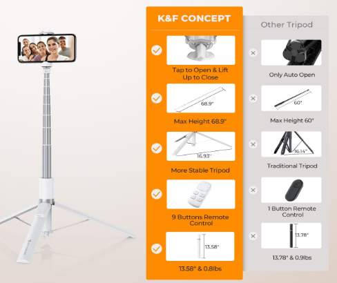K&F Concept Aluminium Selfie Stick X96 70-inch je univerzálny, ľahký (0,8 lb/376 g) statív z hliníkovej zliatiny s inovatívnym magnetickým upevnením s automatickým otváraním/zatváraním pre jednoduchú obsluhu jednou rukou, s dĺžkou od 13,6 do 68,9 palca pre stabilné širokouhlé zábery. Vďaka 360° horizontálnemu a 180° vertikálnemu otáčaniu v dvoch osiach, 9-tlačidlovému nabíjateľnému Bluetooth diaľkovému ovládaču pre fotografie, zoom, prepínanie fotoaparátov a ovládanie videa a univerzálnej kompatibilite s telefónmi so šírkou 2,17–3,35 palca a studnou päticou pre mikrofóny/svetlá je to dokonalý prenosný spoločník pre cestovateľské vlogi, živé prenosy a rodinné fotografie.
