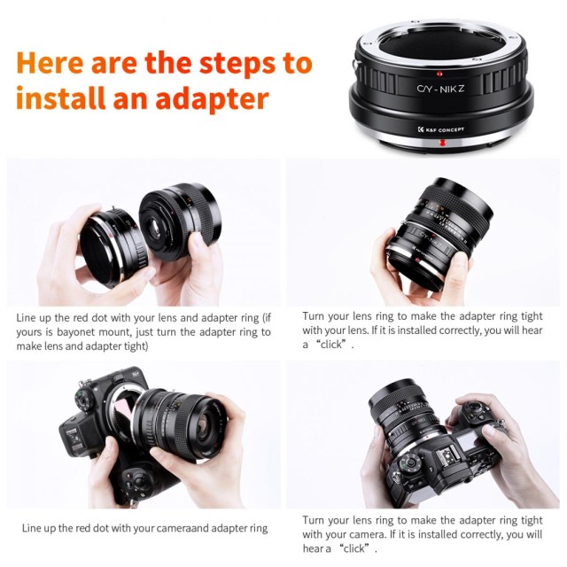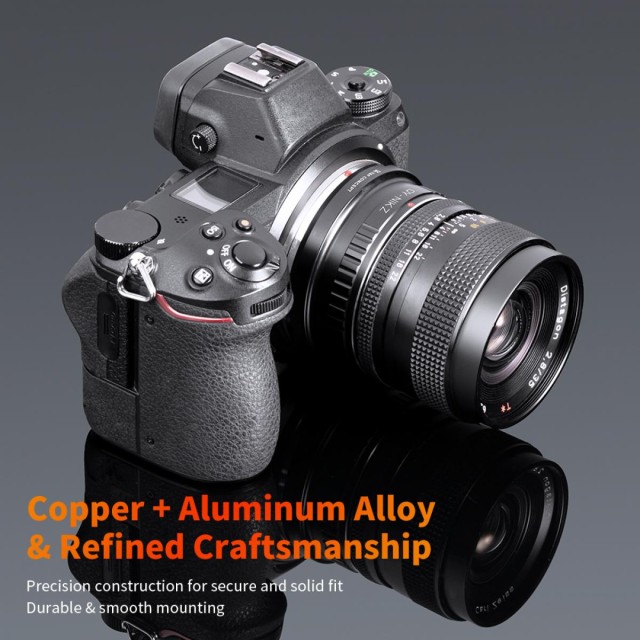 Adaptér objektívu K&F Concept Contax Yashica na Nikon Z umožňuje používať objektívy s bajonetom Contax/Yashica (C/Y) na bezzrkadlových fotoaparátoch Nikon Z, ako sú Z6 a Z7. Je vybavený hladkým medeným rozhraním pre jednoduchú montáž, podporuje plne manuálne ovládanie s nekonečným zaostrením a obsahuje jasné značky pre jednoduchú inštaláciu.