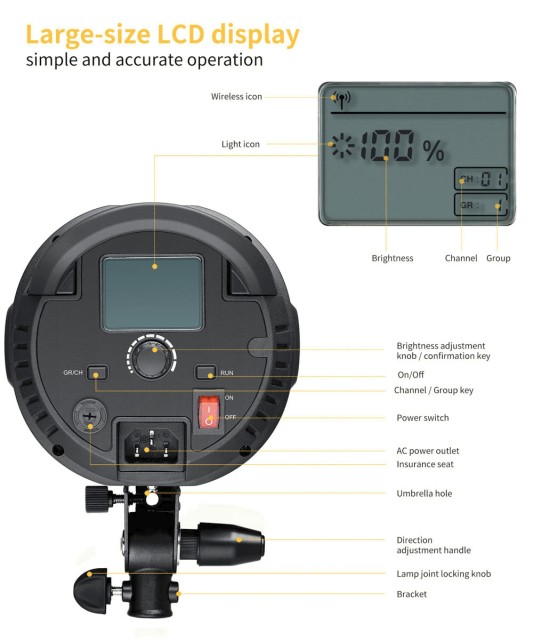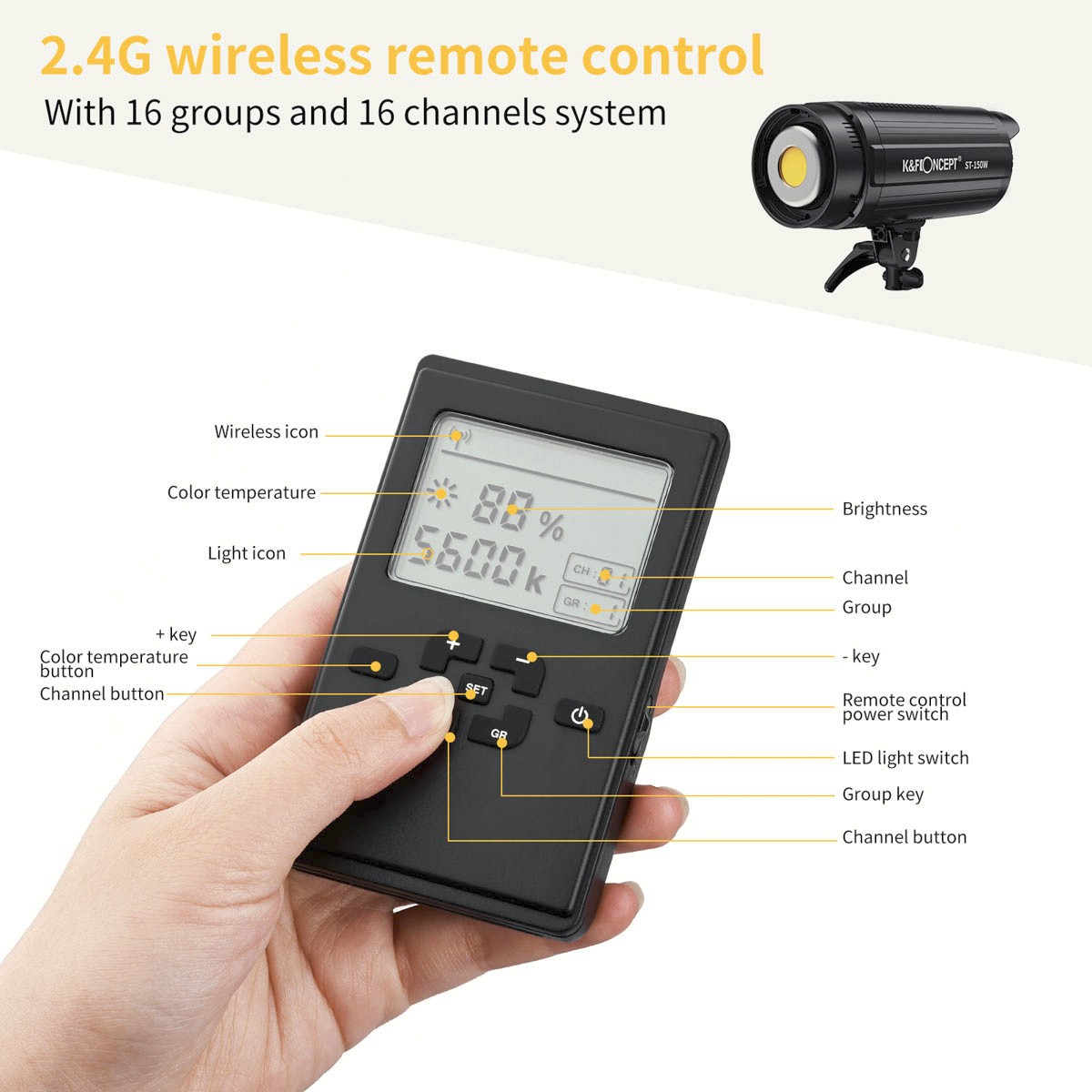 S CRI 95 a TLCI 95+ zabezpečuje ST-150W prirodzené odtiene pleti a presnú reprodukciu farieb. Jas sa dá plynule nastaviť od 10 % do 100 % pomocou zadného ovládača stmievania alebo priloženého bezdrôtového diaľkového ovládača. Veľký, prehľadný LCD displej zobrazuje percentuálny jas, kanál a nastavenia skupín, čo umožňuje zoskupiť a ovládať viacero svetiel súčasne.