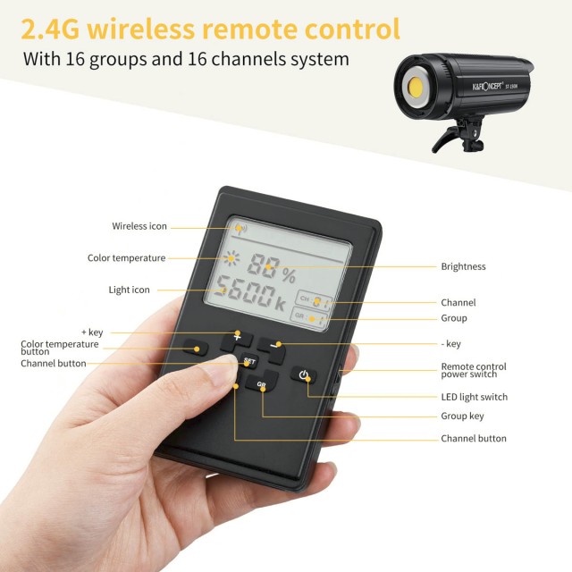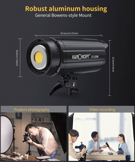 Svetlo je vyrobené z pevného hliníkového zliatinového puzdra a je vybavené efektívnym systémom odvádzania tepla s prémiovým chladičom a ultra tichým chladiacim ventilátorom, čo zaručuje dlhodobú stabilitu bez rušenia zvukového záznamu. Populárny držiak Bowens poskytuje širokú kompatibilitu so softboxmi a modifikátormi, zatiaľ čo priložený reflektor a slot na dáždnik umožňujú flexibilné tvarovanie svetla. Vďaka robustnej konštrukcii, možnosti diaľkového ovládania a univerzálnemu držiaku na stojan je K&F ST-150W spoľahlivým osvetľovacím nástrojom pre použitie v štúdiu aj v exteriéri.