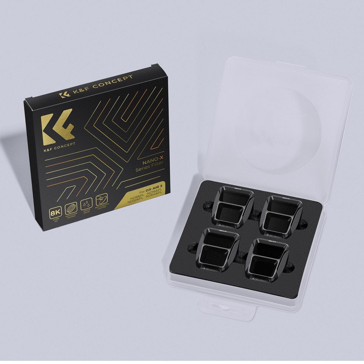 Sada filtrov K&F Concept ND/PL 2 v 1 pre DJI Air 3 je navrhnutá tak, aby poskytovala pilotom dronov a leteckým kameramanom maximálnu kreatívnu kontrolu v kompaktnom dizajne, ktorý je bezpečný pre gimbal. Táto 4-dielna sada obsahuje filtre ND8/PL, ND16/PL, ND32/PL a ND64/PL, ktoré ponúkajú 3 až 6 stupňov redukcie svetla a zároveň eliminujú odlesky z nekovových povrchov, ako je voda, sklo a sneh. Kombináciou funkcií ND a CPL v jednom filtri táto sada znižuje potrebu vrstvenia filtrov a zaisťuje optimálnu rovnováhu a výkon.