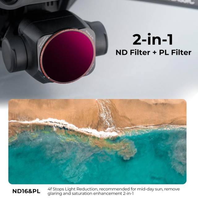 Filter K&F Concept ND16 & PL, navrhnutý špeciálne pre DJI Mavic 3 Classic, integruje dva základné efekty do jedného filtra. Funkcia ND16 redukuje prichádzajúce svetlo o 4 stupne, čo je ideálne pre fotografovanie za jasného denného svetla a umožňuje lepšiu kontrolu nad rýchlosťou uzávierky a expozíciou. Vstavaný CPL (polarizátor) pomáha minimalizovať odrazy a oslnenie z nekovových povrchov, ako je voda a sklo, a zároveň zlepšuje sýtosť farieb a kontrast pre živšie letecké zábery.