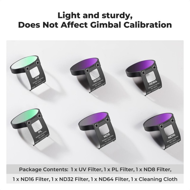 Táto najnovšia sada ND, CPL a UV filtrov od spoločnosti K&F Concept je špeciálne navrhnutá pre DJI NEO, každý filter je ľahký 0,5 g, čo zaisťuje bezpečnosť gimbalu, ktorý je vyrobený zo špičkového HD optického skla, zabezpečuje krištáľovo čistý obraz počas leteckého snímania. Súprava filtrov ND8, ND16, ND32 a ND64 pomáha redukovať rôzne úrovne svetla, od 3 do 6 stupňov, presne ovládať rýchlosť uzávierky, získať správnu kontrolu expozície v rôznych svetelných podmienkach a vytvárať plynulé zábery.