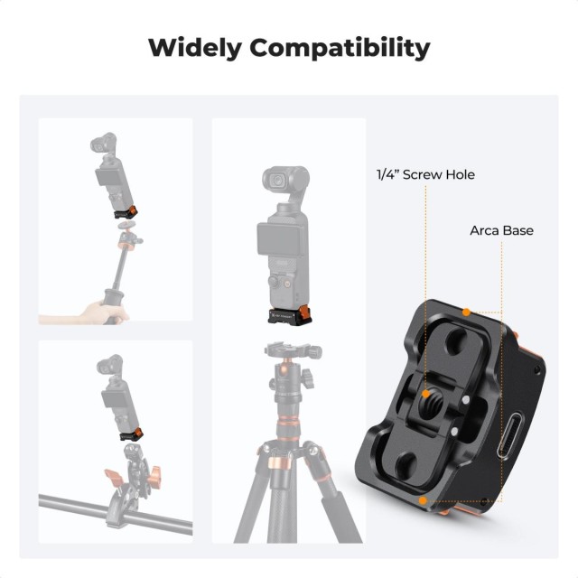 Základňa nabíjacieho adaptéra pre DJI Osmo Pocket 3, stolný nabíjací dok typu C, vhodný pre štandard Arca-Swiss, s 1/4 otvorom na skrutku/sklápacím prstom, držiak z hliníkovej zliatiny. Držiak nabíjacieho adaptéra pre Pocket 3 umožňuje zmeniť smer nabíjacieho portu, vďaka čomu môže Pocket 3 samostatne stáť na rovnom povrchu a súčasne sa nabíjať a fotografovať.