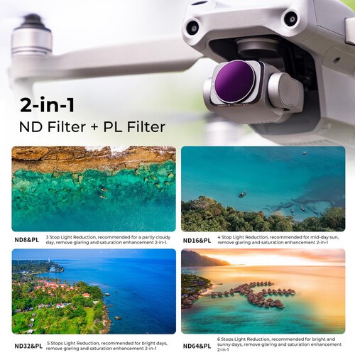 Vylepšite svoje letecké fotografie a videá s pomocou sady filtrov K&F Concept ND/PL pre DJI Air 2S. Táto sada obsahuje 4 filtre ND8/PL, ND16/PL, ND32/PL a ND64/PL, z ktorých každý kombinuje výhody neutrálneho filtra s kruhovým polarizátorom. Funkcia CPL odstraňuje odlesky a odrazy a zároveň zlepšuje sýtosť farieb, zatiaľ čo komponent ND redukuje svetlo o 2–6 stupňov, čo vám umožňuje zachytiť plynulé rozmazanie pohybu a správne exponované zábery za jasného slnečného svetla alebo čiastočne zamračených podmienok.