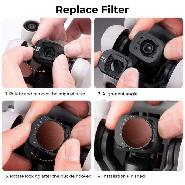 DJI Drone Mini 3 Pro & Mini 3 Variabilný filter ND32-ND512 s jednostrannou antireflexnou zelenou fóliou. špeciálne navrhnutý pre DJI Mini 3 Pro. Zníženie o 5-9 f-stupňov na dosiahnutie požadovanej expozície pri meniacom sa svetle, vhodný pre jasné a slnečné denné svetlo.