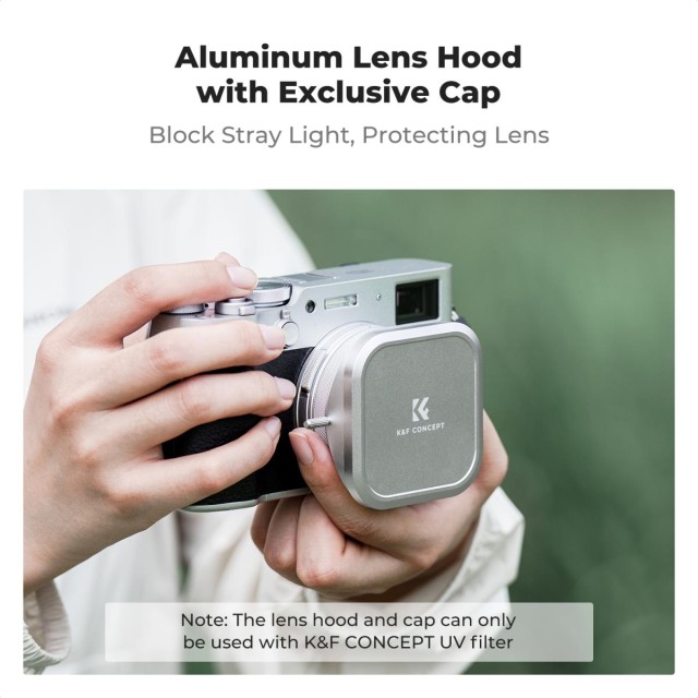 Kompatibilný s fotoaparátmi Fujifilm X100/X100F/X100S/X100T/X100V/X100VI. UV filter je vyrobený z importovaného optického skla AGC, s priepustnosťou svetla až 99,6 % a 28 vrstvami vodovzdorného a odolného proti poškriabaniu povlaku na oboch stranách. Redukuje ultrafialové žiarenie a pomáha eliminovať modrastý nádech na snímkach. Chráni objektív pred prachom, nečistotami a škrabancami.