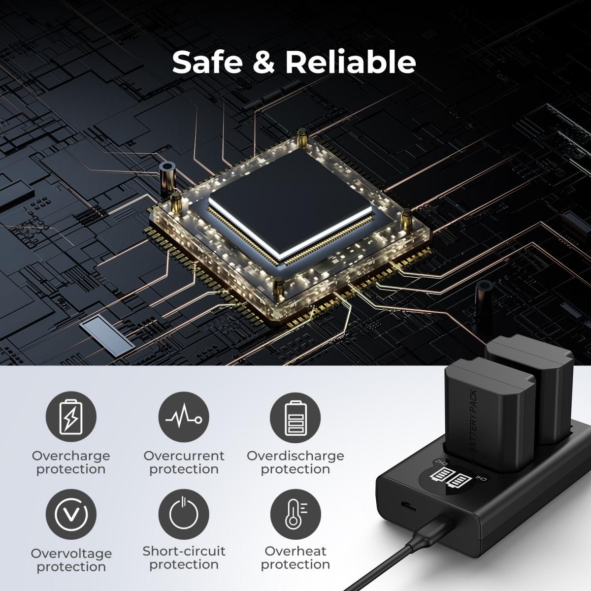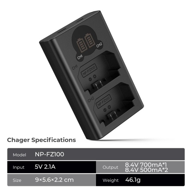 Nabíjajte svoje batérie Sony NP-FZ100 efektívne pomocou dvojkanálovej nabíjačky K&F FZ100. Vďaka dvojitým nabíjacím portom a univerzálnemu vstupu USB-C/Micro USB môže táto nabíjačka napájať dve batérie súčasne a zároveň inteligentne chrániť pred preťažením, nadmerným prúdom a prehriatím.