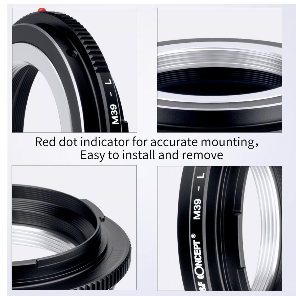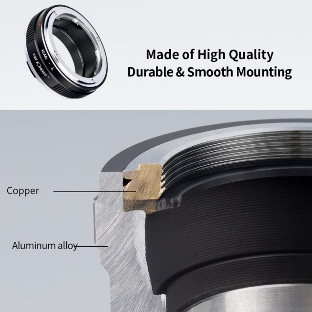 Vysoko presný adaptér objektívu K&F M39 na L-Mount umožňuje používať objektívy s bajonetom Leica M39 na bezzrkadlových fotoaparátoch s bajonetom L-Mount. Je vyrobený z vysoko kvalitnej zliatiny medi a hliníka a vyznačuje sa presným zarovnaním, hladkou montážou, plne manuálnym ovládaním a nastaviteľným clonovým krúžkom.