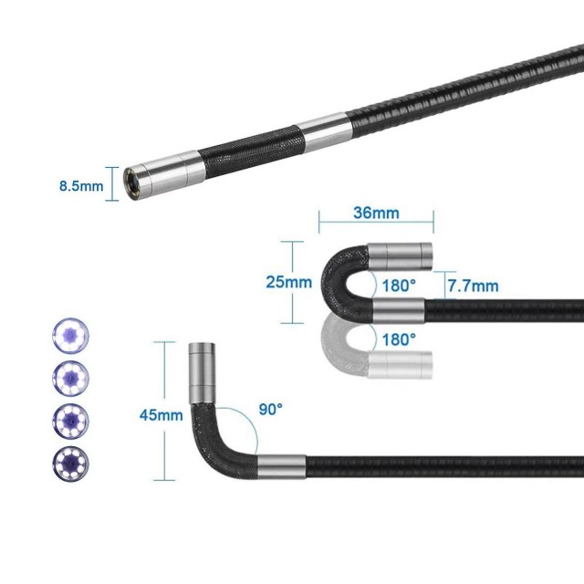 - * 【Obousmerný 180° riadiaci objektív】Odchyľuje sa ľahko a flexibilne o 180° na oboch stranách, vďaka čomu sa malé sondy môžu dostať do stiesnených priestorov a potom prostredníctvom kábla prenášať živé, jasné a všestranné videá a obrázky na obrazovky monitorov a mobilných telefónov súčasne. Je to odporúčaná tesne zakrivená endoskopická kamera so svetlom.