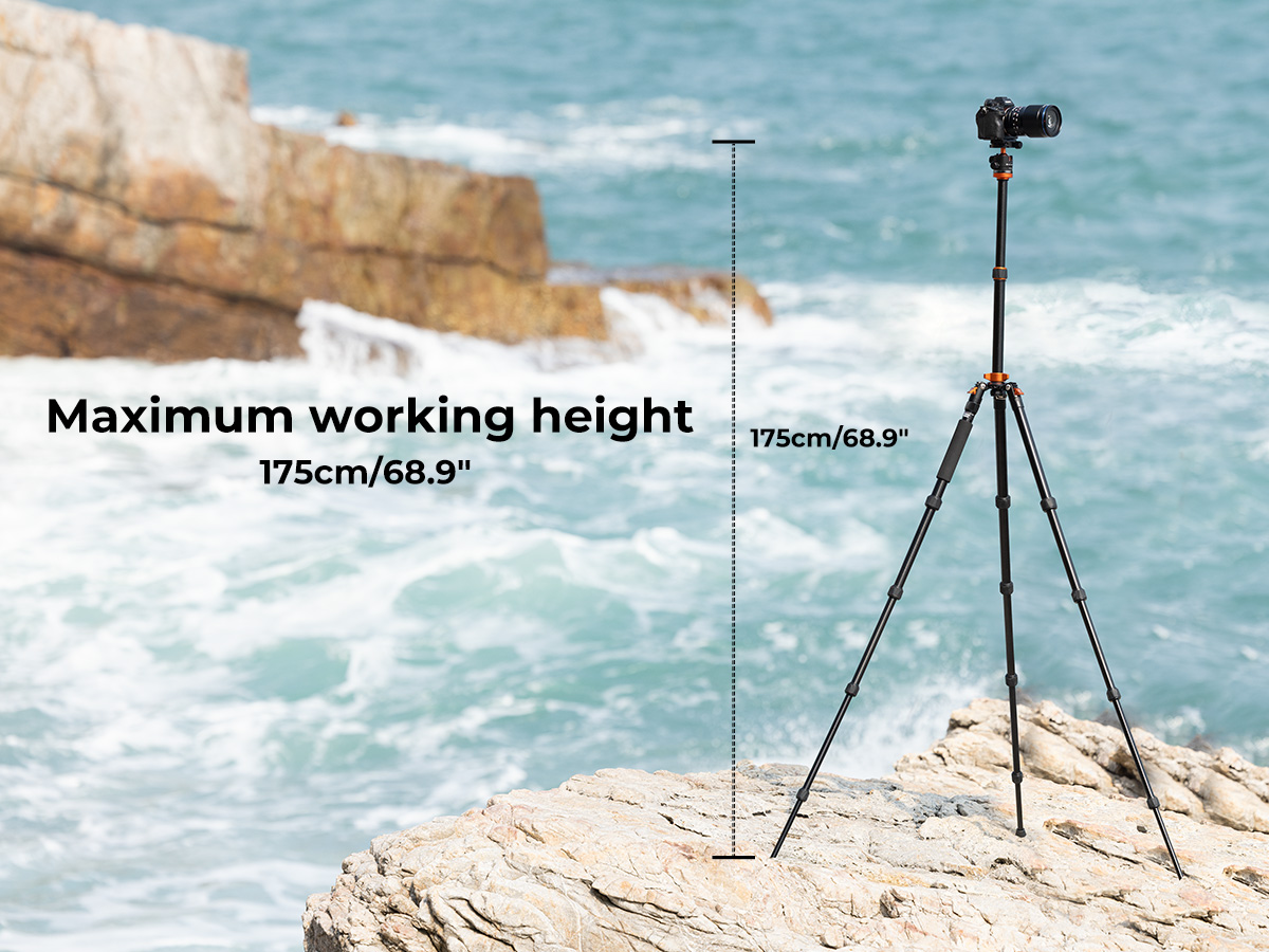 * 【JEDNODUCHÉ NASTAVENIE】 5 sekcií trubicovej nohy a maximálny priemer je 25 mm; aretačný gombík špirálového typu umožňuje nastaviť pracovnú výšku v priebehu niekoľkých sekúnd; výška bez stĺpika dosahuje 51'' a výška s 2 sekciami stredového stĺpika je 67'', čo uľahčuje fotografovanie v stoji.