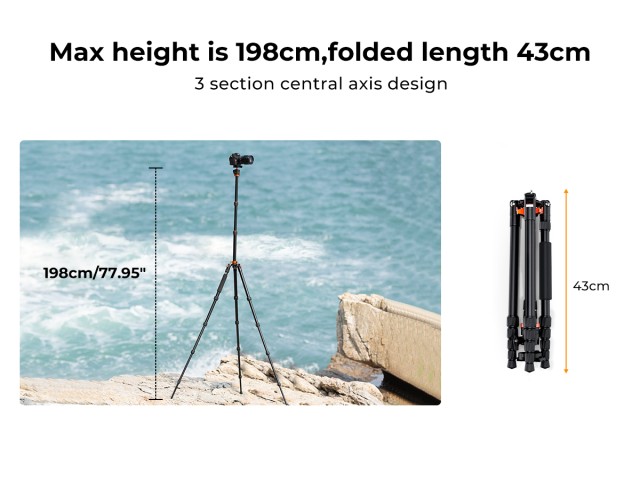 Inovatívna konštrukcia s 3 sekciami centrálnej osi umožňuje statívu dosiahnuť zvýšenú fotografickú výšku 198 cm pri zachovaní kompaktnej dĺžky zloženého statívu 43 cm. Statív kombinuje praktické funkcie a prenosnosť s maximálnou výškou (bez stredového stĺpika) 135 cm, čím poskytuje bezproblémovú stabilitu a optimalizovanú výšku snímania ideálnu na použitie v interiéri alebo exteriéri. Maximálna výška je 198 cm, vďaka čomu je fotografovanie v stoji jednoduchšie ako kedykoľvek predtým. Minimálna výška je 56 cm, vďaka čomu je toto zariadenie prispôsobiteľné takmer všetkým podmienkam a prostrediam.