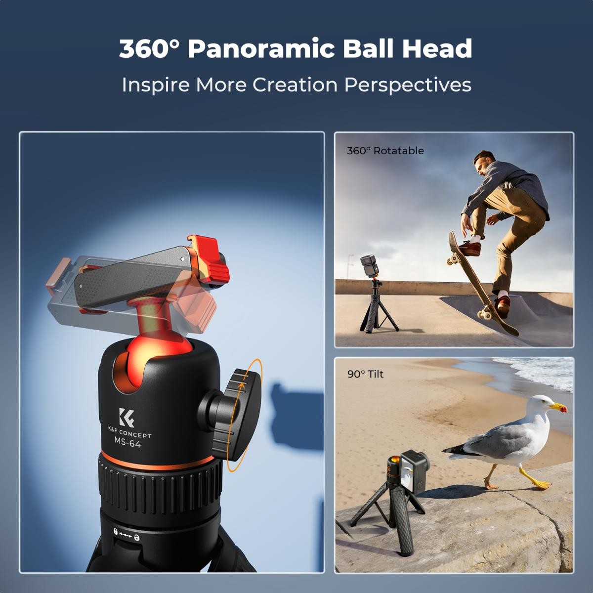 Konštrukcia guľovej hlavy umožňuje otáčanie o 360° a naklonenie o 90°, čím zabezpečuje voľné nastavenie uhla a vertikálne fotografovanie. Integrovaný 1/4" závit na guľovej hlave umožňuje pripojiť mikrofón alebo osvetlenie pre lepšiu kvalitu videa.