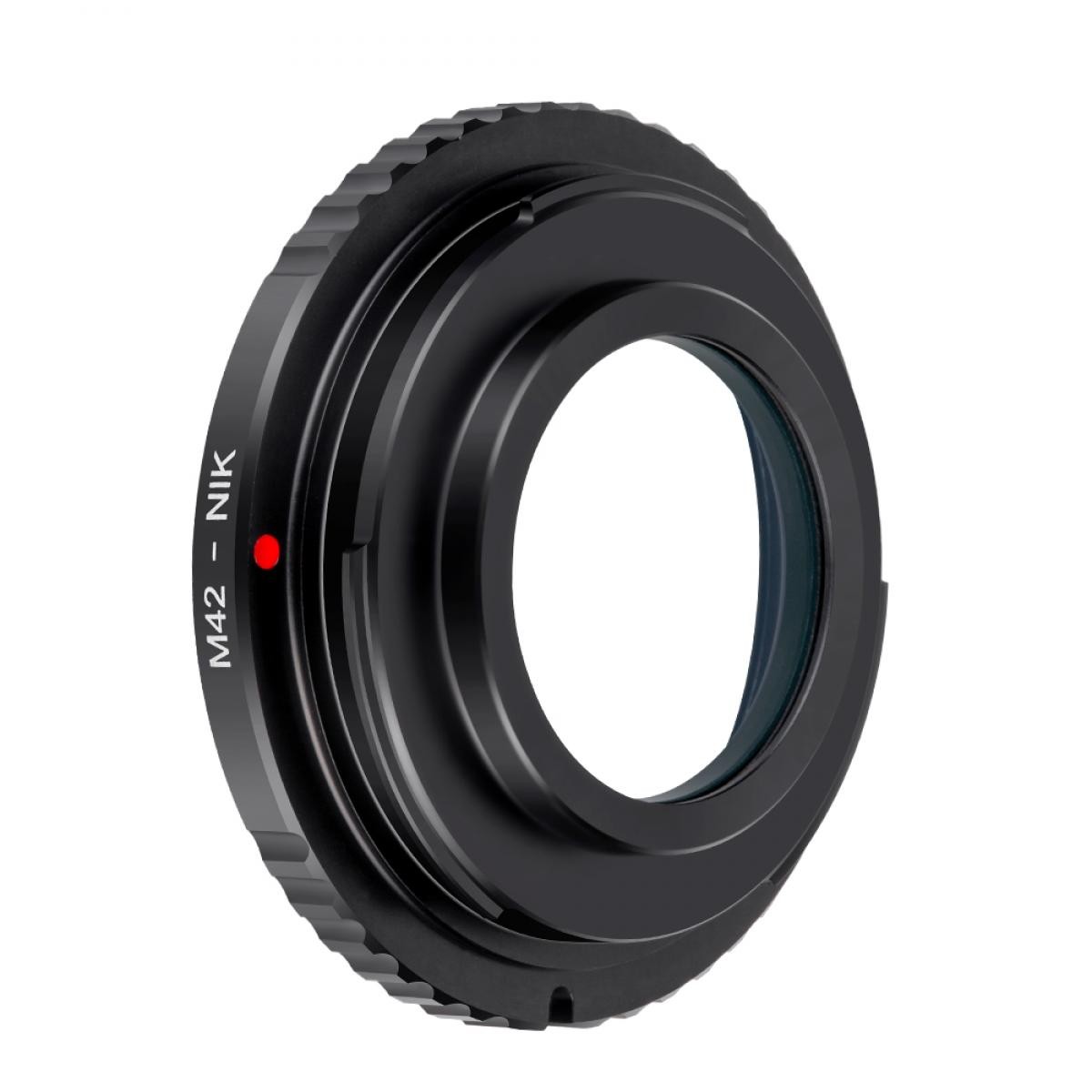 Adaptér objektívu K&F M42 na Nikon s optickým sklom umožňuje použitie objektívov s bajonetom M42 na digitálnych zrkadlovkách Nikon. Vyznačuje sa odolnou konštrukciou z mosadze a hliníka, presným manuálnym ovládaním a integrovaným optickým sklom pre nekonečné zaostrenie.