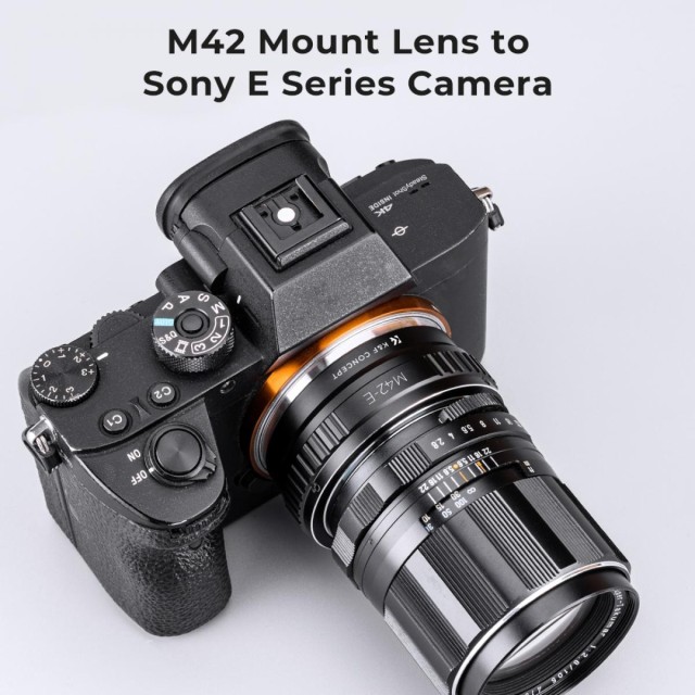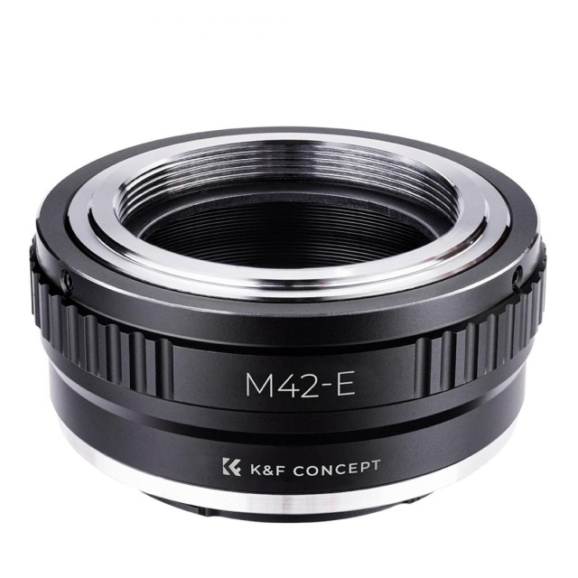 Adaptér objektívov K&F M42 na fotoaparát Sony E Mount. Umožňuje použitie objektívov s bajonetom M42 na tele fotoaparátu Sony E NEX/Alpha. Vyrobený z mosadze a hliníka. Stabilná, presná a odolná konštrukcia. manuálne ovládanie. povolené nekonečné zaostrovanie.
