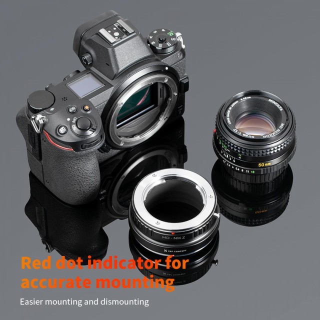 Adaptér objektívu K&F Concept Minolta MD/MC na Nikon Z umožňuje používať klasické objektívy Minolta MD a MC na fotoaparátoch Nikon s bajonetom Z, ako sú Z6 a Z7. Je vyrobený z hladkej, odolnej medi, podporuje plne manuálne zaostrovanie, zaostrovanie na nekonečno a je vybavený červenou bodkou pre jednoduchú inštaláciu.