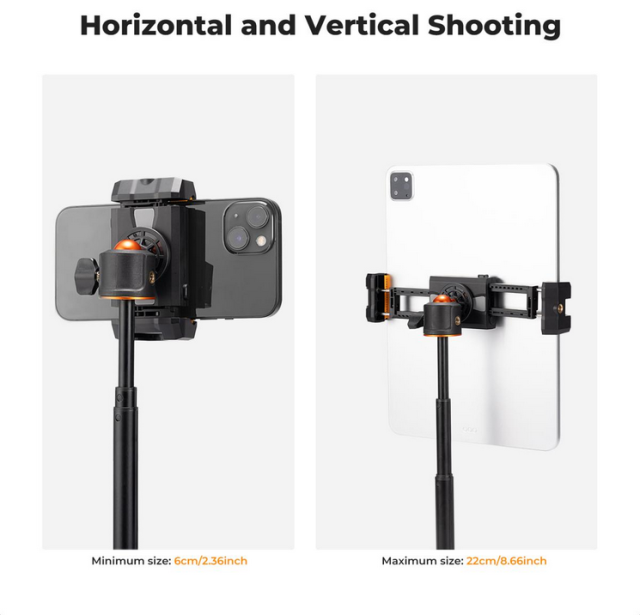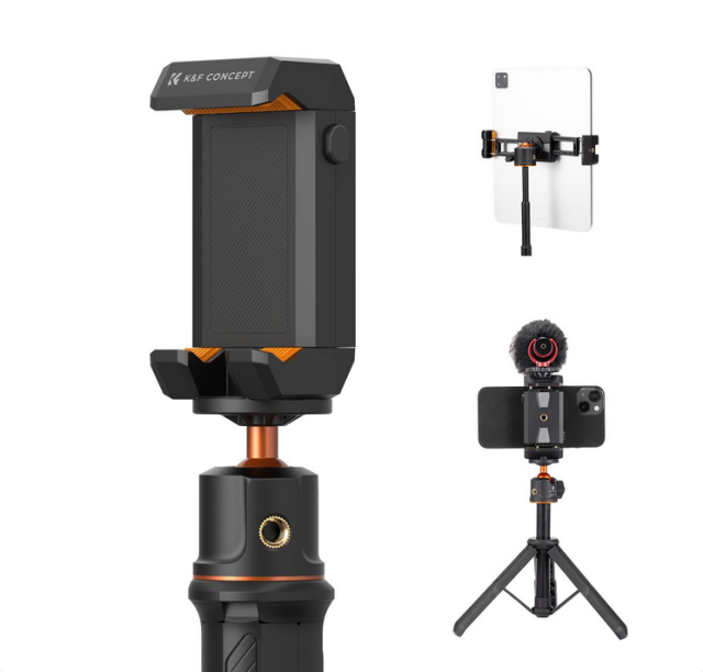 K&F MS20 je všestranný držiak na telefón a tablet 2 v 1 navrhnutý pre pohodlie a flexibilitu. Umožňuje bezpečné upevnenie mobilného telefónu aj tabletu súčasne, čo uľahčuje úpravu nastavení jediným kliknutím a potiahnutím. Držiak je vybavený rozhraním cold shoe na pripevnenie rôzneho fotografického príslušenstva, ako sú mikrofóny a plniace svetlá. Vďaka nastaviteľnej šírke v rozsahu 6-22 cm a viacerým 1/4" otvorom pre skrutky na pripojenie statívu alebo zariadenia poskytuje robustnú podporu a prispôsobivosť. Kompaktný dizajn, ľahká konštrukcia a duté dno zabezpečujú jednoduché skladovanie, kompatibilitu s nabíjaním a ochranu zariadenia.