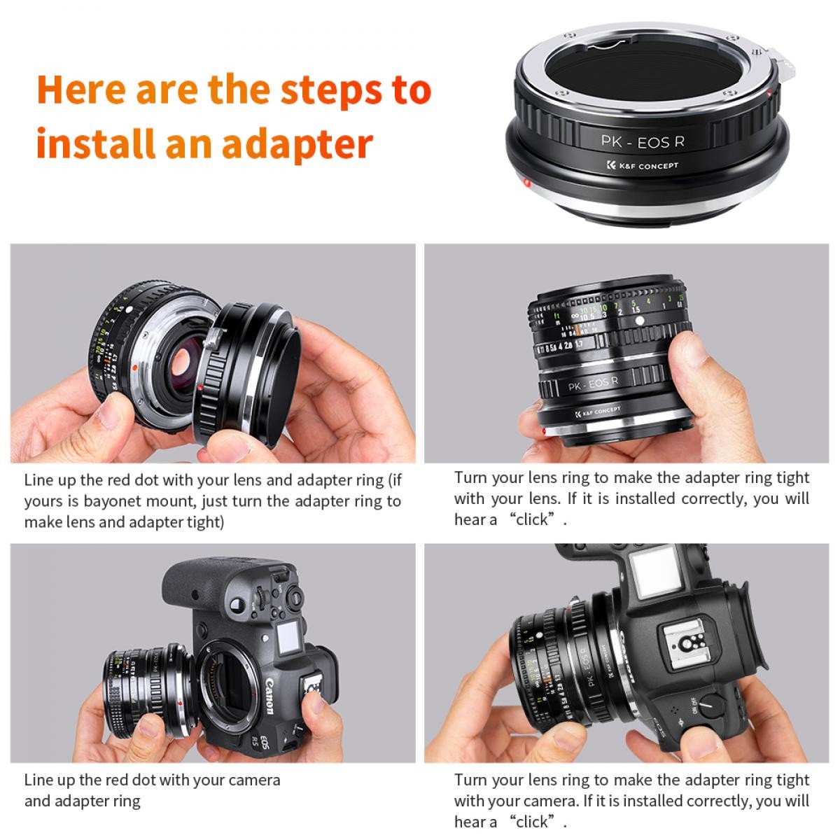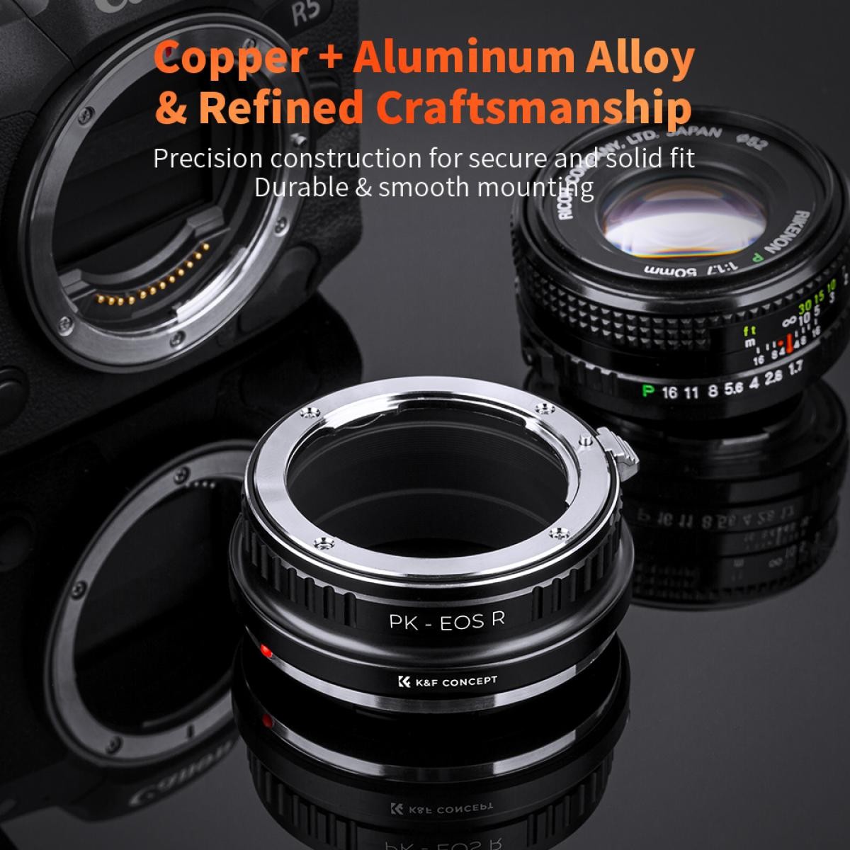 Adaptér objektívov K&F Pentax K na fotoaparát Canon EOS R je určený pre fotografov, ktorí chcú využívať jedinečné vlastnosti objektívov s bajonetom Pentax K na moderných bezzrkadlových fotoaparátoch Canon EOS R. Adaptér je precízne vyrobený z vysoko kvalitnej mosadze a hliníka a poskytuje bezpečné a stabilné pripojenie, pričom zaručuje dlhodobú odolnosť. Tento plne manuálny adaptér umožňuje manuálne zaostrovanie a manuálne ovládanie clony priamo z objektívu a podporuje nekonečné zaostrovanie pre univerzálne a presné fotografovanie. Je ideálny na kreatívne experimentovanie so staršími objektívmi a poskytuje spoľahlivé a vysoko presné uchytenie ako pre bežné fotografovanie, tak aj pre profesionálnu prácu. Pri ťažkých alebo veľkých objektívoch, najmä strednoformátových, sa odporúča používať teleobjektívový držiak alebo statív, aby sa počas používania zachovala stabilná rovnováha.