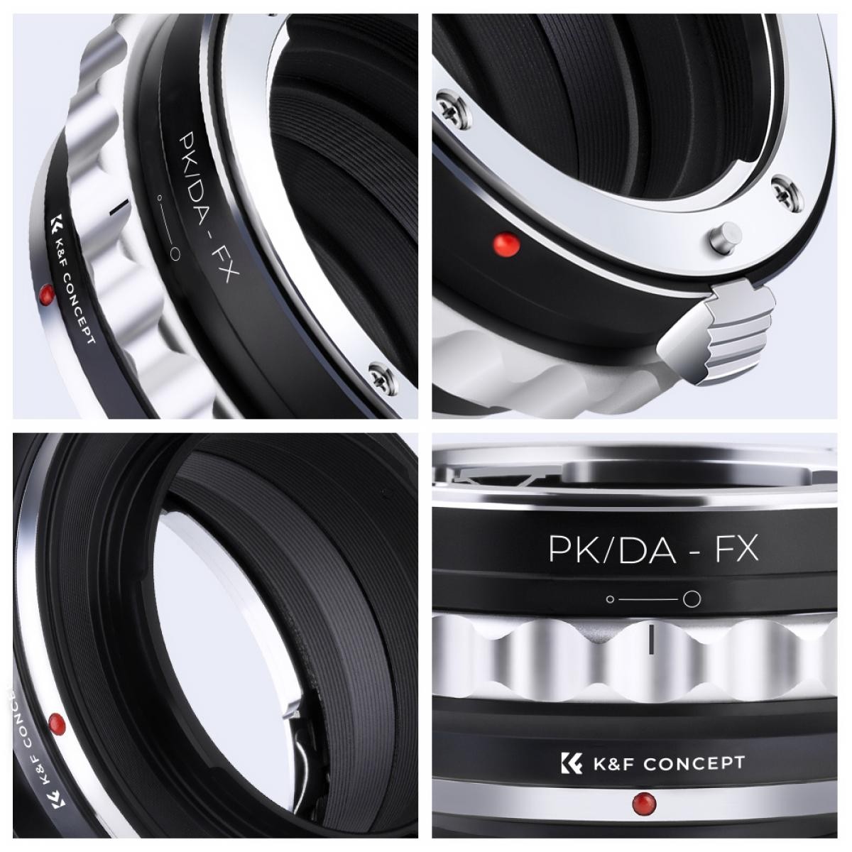 Adaptér K&F Pentax K/M/A/FA/DA na Fuji X Mount umožňuje použitie objektívov Pentax na bezzrkadlových fotoaparátoch Fujifilm radu X. Je vyrobený z odolnej mosadze a hliníka, má manuálne ovládanie a plnú podporu nekonečného zaostrenia.