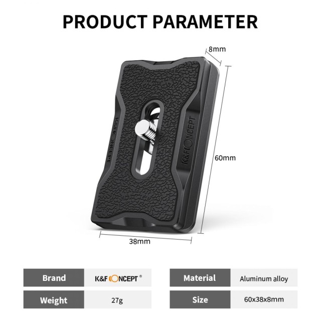 Rýchloupínací tanier K&F je presne vyrobený z vysoko kvalitnej hliníkovej zliatiny pomocou CNC obrábania a povrchovo upravený anodickou oxidáciou pre zvýšenú odolnosť a odolnosť proti korózii. Je navrhnutý pre použitie s rýchloupínacím systémom Arca-Swiss a ponúka vysokú kompatibilitu s väčšinou guľových hláv a statívov. Štandardný 1/4" závit umožňuje použitie s širokou škálou fotoaparátov, vrátane modelov SLR a DSLR. Veľká pogumovaná kontaktná plocha zvyšuje trenie medzi fotoaparátom a doskou, čím zabezpečuje pevné uchytenie a zabraňuje náhodnému skĺznutiu alebo pohybu. Kompaktná, ľahká a ľahko použiteľná rýchloupínacia doska umožňuje fotografom namontovať alebo odstrániť fotoaparát za niekoľko sekúnd, čo ju robí ideálnou pre rýchle fotografovanie, cestovanie a každodenné fotografovanie.
