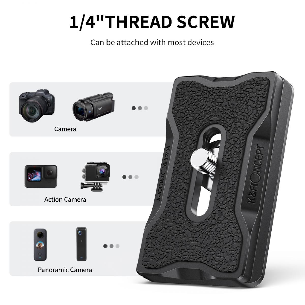 Rýchloupínací tanier K&F je ľahké a odolné upevňovacie riešenie kompatibilné s Arca-Swiss, navrhnuté pre rýchle pripevnenie a odstránenie fotoaparátu, pričom poskytuje bezpečné, nešmykľavé pripojenie pre fotoaparáty a statívy.