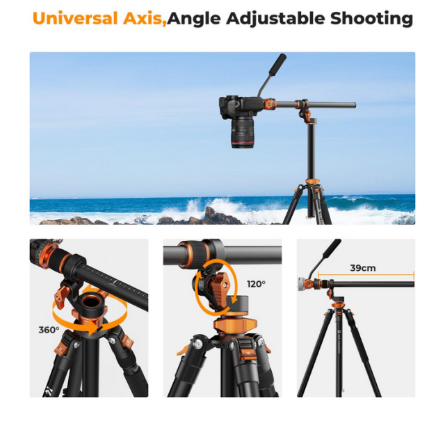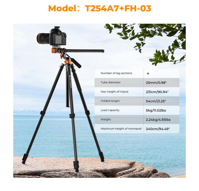 Statív K&F T254A7+FH-03 s fluidnou hlavou ponúka všestranné a plynulé snímanie nad hlavou a panoramatické snímanie. Patentovaná stredová os umožňuje nastavenie sklonu 0-120° a horizontálne nastavenie 360°, čím podporuje rôzne uhly. Hydraulická hlava s nosnosťou 5 kg poskytuje stabilné a plynulé pohyby a podporuje +90°/-90° náklon a 360° panoramatické snímanie. Statív sa vysúva až do výšky 2,31 m a skladá sa na 54 cm, pričom je vybavený 28 mm stredovou osou na zabezpečenie stability. Obsahuje 360-stupňovú horizontálnu stupnicu na jednoduché panoramatické fotografie a odnímateľný monopod s výsuvom až do 2,4 metra na flexibilitu v stiesnených priestoroch.