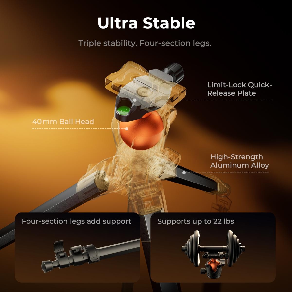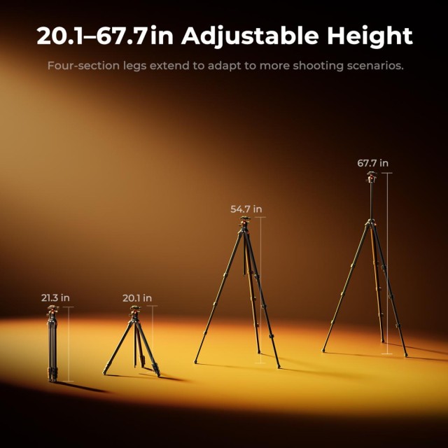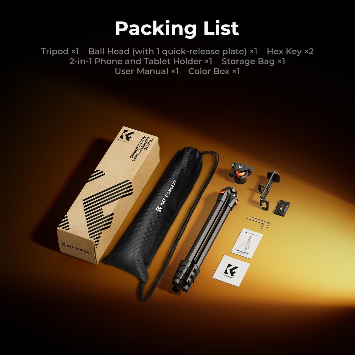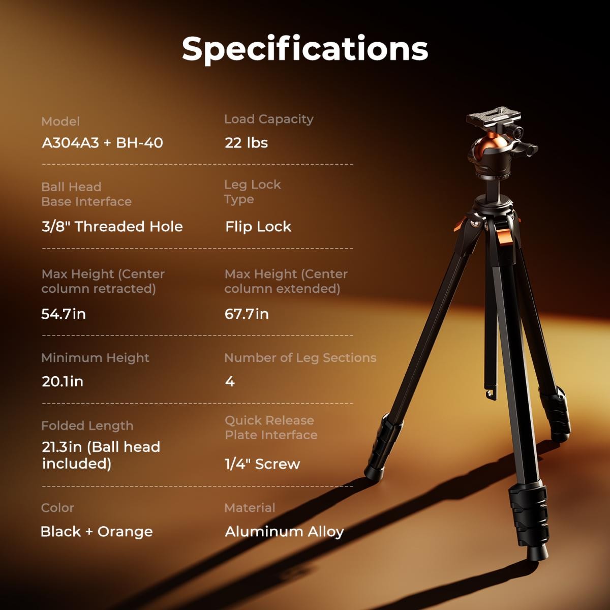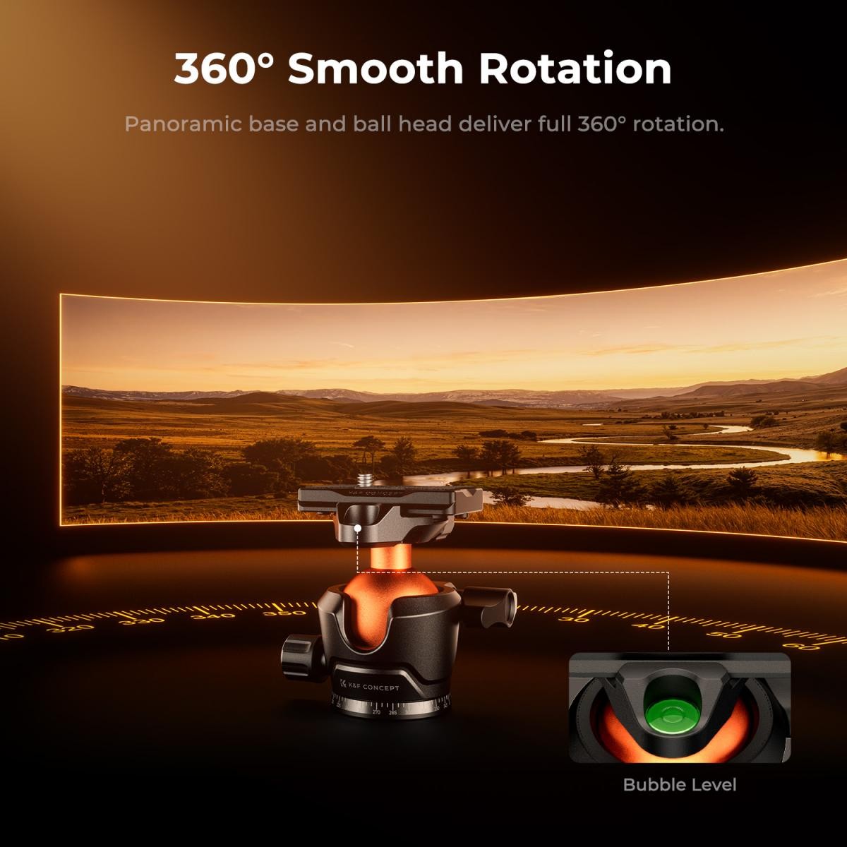 Stativ K&F A304A3+BH-40 je 67" (172 cm) vysoký hliníkový cestovný stativ na fotoaparát s guľovou hlavou, ktorý je kompatibilný so systémom Arca. Stativ je kompaktný, ľahký a prenosný, vhodný pre digitálne zrkadlovky, bezzrkadlovky, ďalekohľady, iPhone alebo teleprompter.