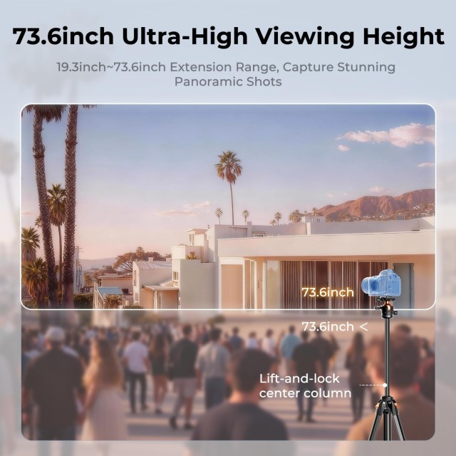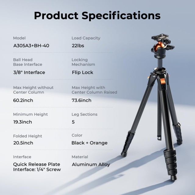 Statív K&F Concept A305A3+BH-40 spája pevnosť a prenosnosť v dizajne vhodnom na cestovanie. Je vyrobený z odolnej zliatiny hliníka a unesie až 10 kg, vďaka čomu je vhodný pre full-frame digitálne zrkadlovky s teleobjektívmi, ako aj bezzrkadlové fotoaparáty, smartfóny a tablety. Statív ponúka široký rozsah výšky od 48 cm do impozantných 185 cm vďaka nastaviteľnému stredovému stĺpiku, čo umožňuje pohodlné fotografovanie v rôznych uhloch a výškach.