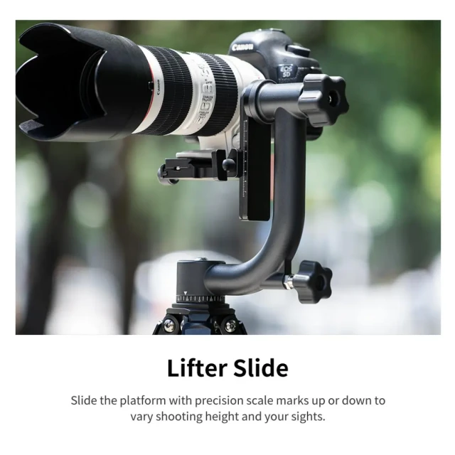 ·Presné nastavenie: Veľké gombíky s vodováhou sa ľahko používajú a očíslované stupnice pozdĺž otočnej základne a vertikálneho ramena vám umožňujú ľahko opakovať nastavenia pre rôzne kombinácie objektívov a fotoaparátov.