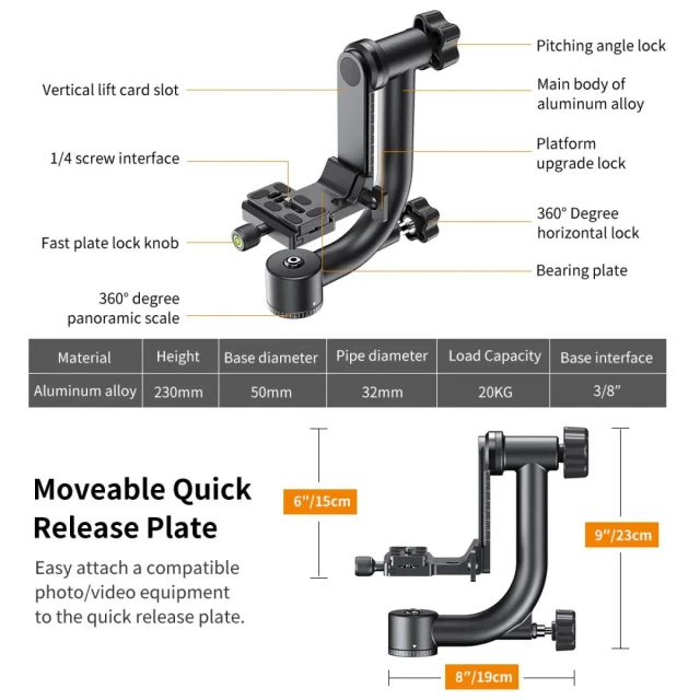 Materiál: zliatina hliníka Nosnosť: 20 kg. Výška: 23 cm. Šírka: 19 cm štandardný 1/4 palcový navijak na fotoaparát