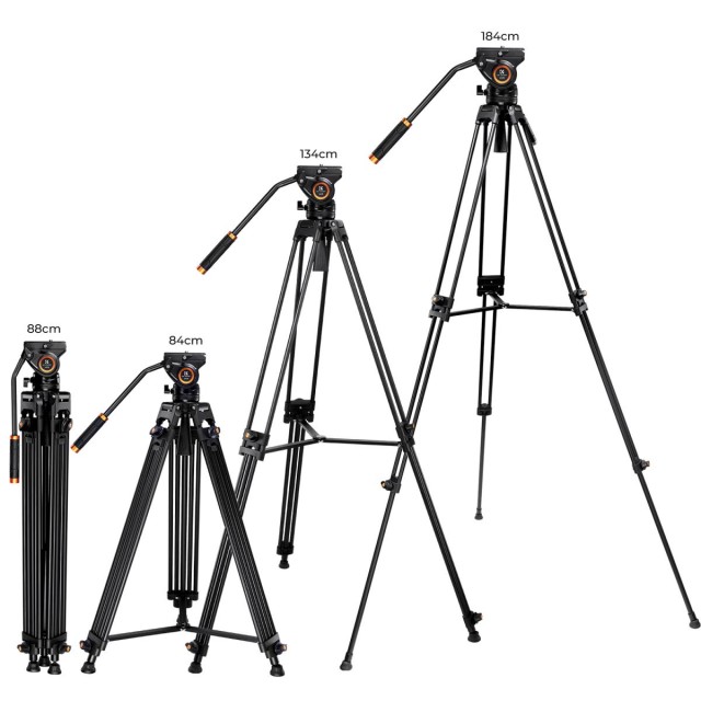 Multifunkčný videostatív. Stabilizujte svoj fotoaparát/kamkordér a zachytávajte ostré fotografie a videá športových podujatí, svadieb, krajiny, ľudí a výrobkov pomocou tohto odolného statívu. Maximálna nosnosť môže byť až 8 kg. Pomocou systému vyváženia a ovládania tlmenia môže videohlava dosiahnuť 360° otáčanie a -70°/90° naklápanie, čo je vhodné na panoramatické snímanie, snímanie zhora nadol a snímanie pod nízkym uhlom. Odnímateľná rukoväť je vhodná na používanie ľavou aj pravou rukou. Výšku statívu možno predĺžiť z 84 cm na 184 cm a zaistiť pomocou výklopných zámkov. Zložená dĺžka je 88 cm s taškou na prenášanie na jednoduché skladovanie a prepravu.