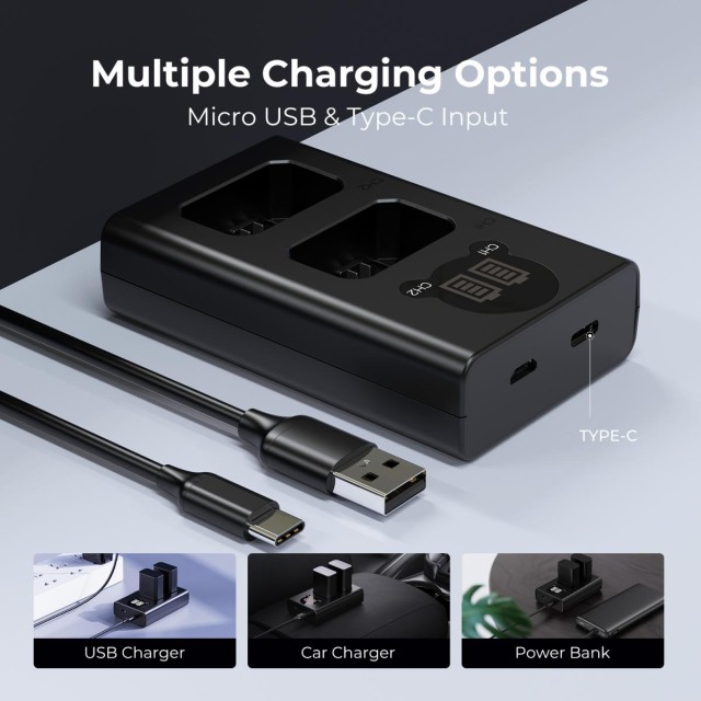 - * Viacero možností nabíjania. Môže nabíjať dve batérie súčasne prostredníctvom notebooku, počítača, nabíjačky do auta, sieťovej nabíjačky alebo powerbanky.