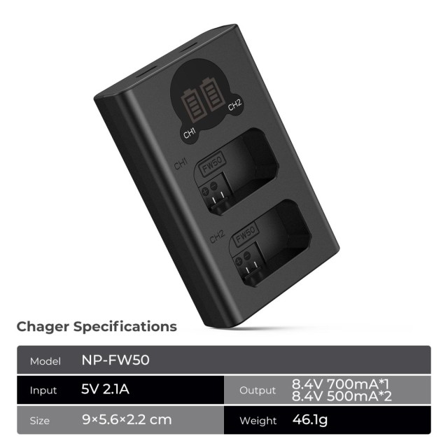 Vhodné pre batérie NP-FW50 fotoaparátov Sony, ako sú Alpha 7, A7, Alpha 7R, A7R, A7R II, A7 II, A7S, A7S II, A7M2, A7SM2, A7RM2, A5000, A6000, A6300, A6500, A3000, NEX-3, NEX-3N, NEX-5, NEX-5C, NEX-5N, NEX-5R, NEX-5T, NEX-6, NEX-7, NEX-C3, NEX-F3, SLT-A33, SLT -A35, SLT-A37, SLT-A55V fotoaparáty atď.