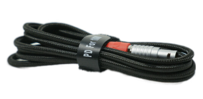100 W opletený napájací kábel: 1,5 m nylonový opletený kábel s pravouhlým 2-pinovým konektorom kompatibilným s LEMO → pravouhlým USB-C konektorom. Dodáva plných 100 W (20 V/5 A) z akéhokoľvek PD zdroja (nástenný adaptér, powerbanka alebo V-mount s USB-C PD výstupom) priamo do 11–19 V vstupu kamery – bez D-Tap, bez regulátorov napätia.