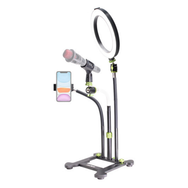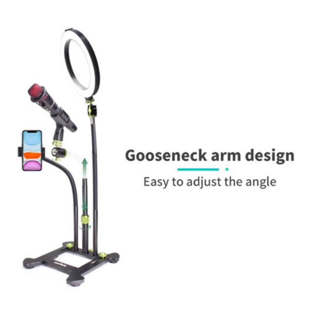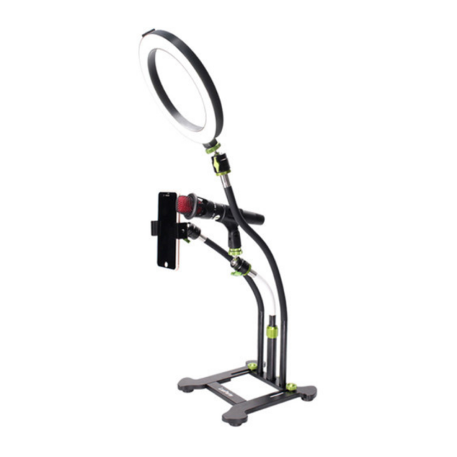 Natáčajte vlogy, livestream a ďalšie videá z akéhokoľvek rovného povrchu pomocou stojana pre smartfón Livestream Desktop od spoločnosti LanParte. Stolový stojan má tri nastaviteľné ramená s gooseneck arms, ktoré sú zakončené držiakom mikrofónu, svorkou na smartfón a nástavcom na kruhové LED svetlo, všetko s plne nastaviteľnými krkmi s ball-jointed necks. Po pridaní všetkého voliteľného príslušenstva vám tento stojan môže poskytnúť to, čo potrebujete na pozdvihnutie vášho obsahu, aby pôsobil uhladenejším a profesionálnejším dojmom.