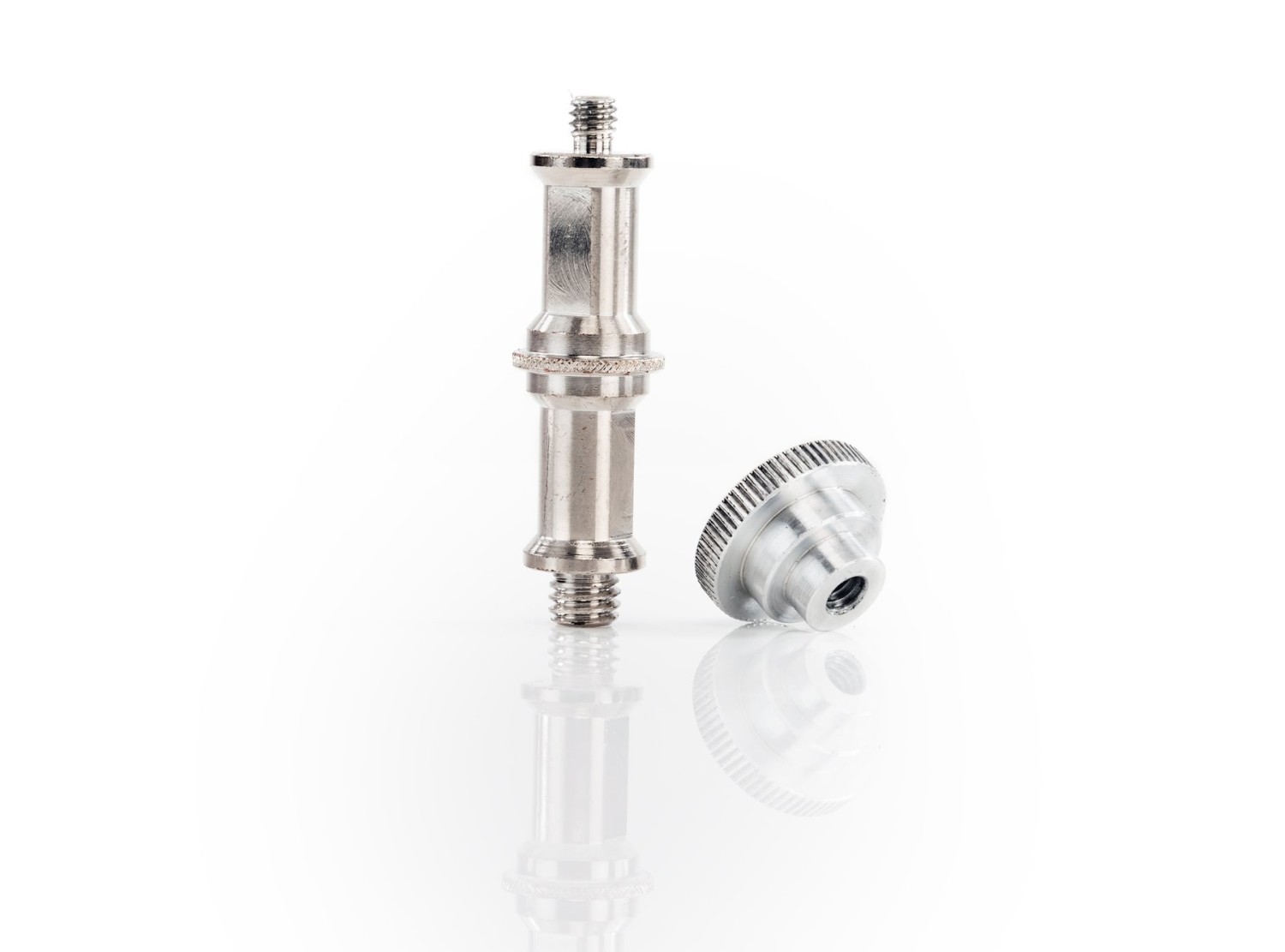 Spigot je vyrobený z odolnej kovovej zliatiny a má štandardný montážny priemer 5/8" (16 mm) spolu so závitovými pripojeniami 1/4"-20 a 3/8"-16, čím zabezpečuje kompatibilitu s širokou škálou osvetľovacieho vybavenia a stojanov. Súčasťou balenia je vroubkované poistné koliesko, ktoré zaisťuje pevné a bezpečné uchytenie a zabraňuje nežiaducemu pohybu počas používania. Tento kompaktný a spoľahlivý adaptér je ideálny pre fotografov pracujúcich v ateliéri aj v exteriéri, ktorí potrebujú spoľahlivé spojenie medzi svojimi bleskovými hlavami a softboxovými modifikátormi.