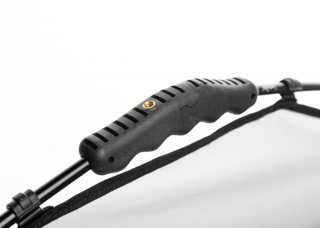 HaloCompact má ergonomickú rukoväť, takže ho môžete držať alebo prenášať jednou rukou. Rukoväť obsahuje aj veľmi užitočný 1" závit (plus adaptér z 1" na 1"), ktorý umožňuje pripojenie k rôznym podporným systémom.