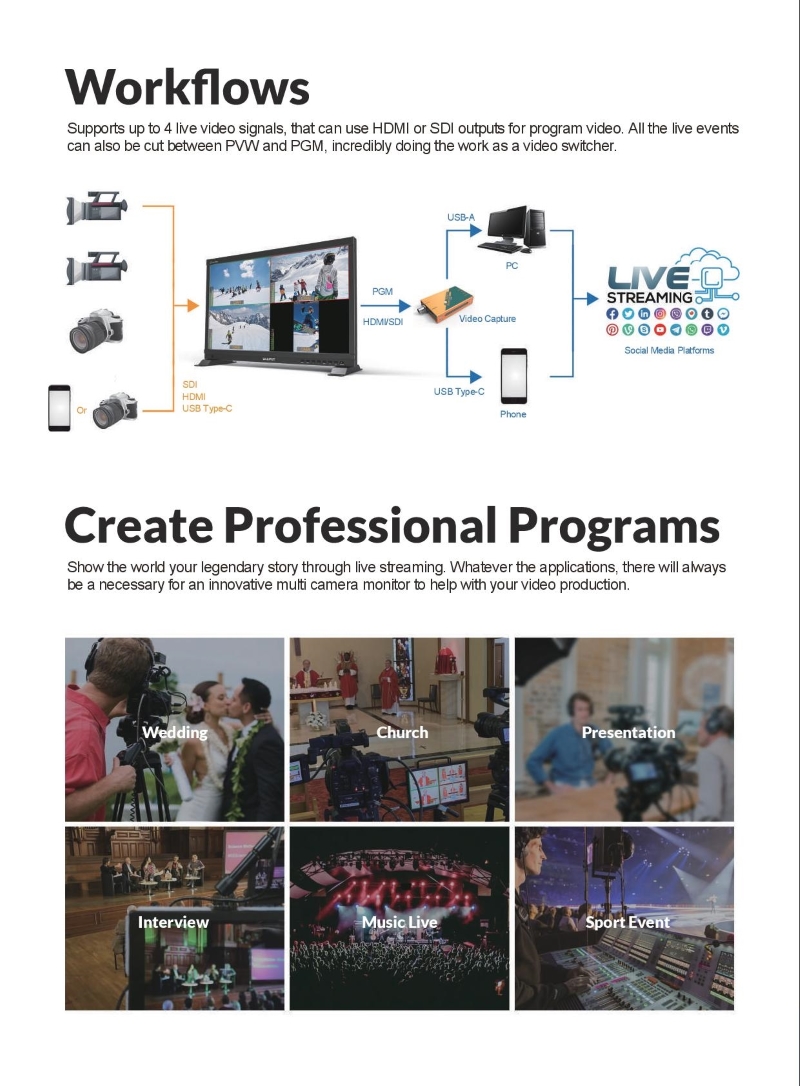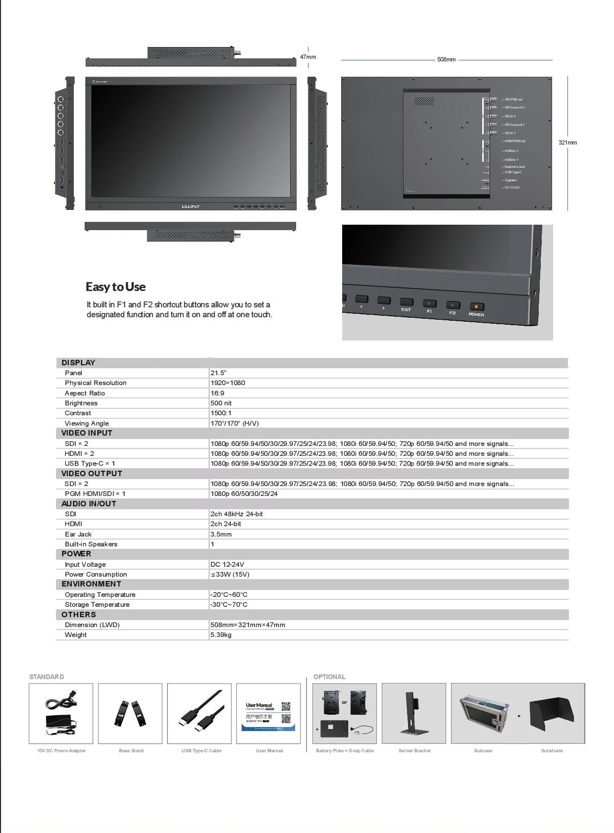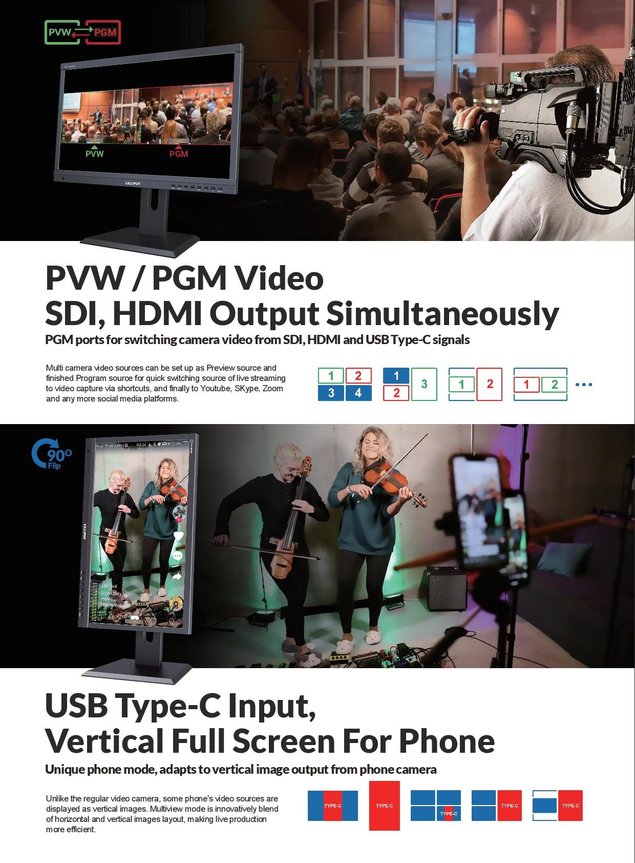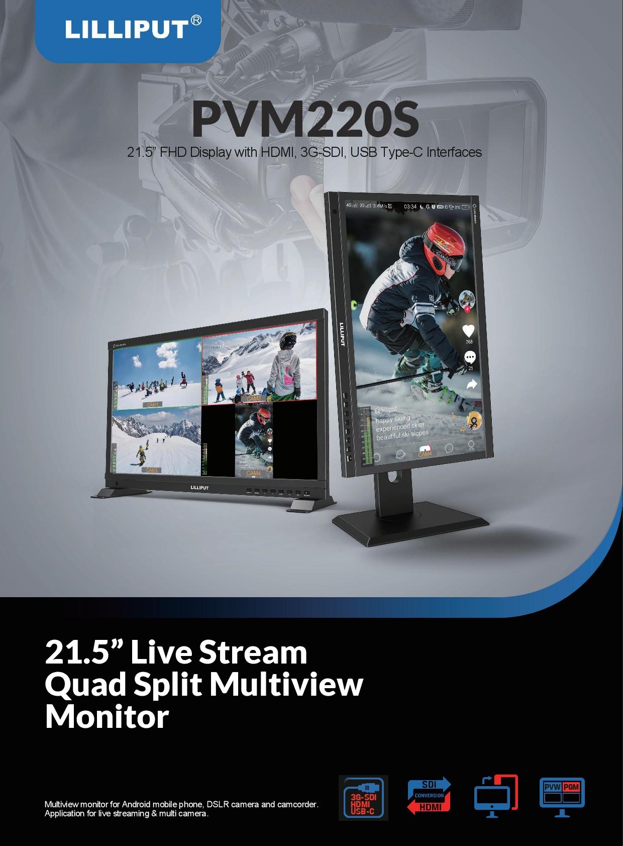 21,5" monitor PVM220S 3G-SDI/HDMI Broadcast Monitor od spoločnosti Lilliput je vybavený štvornásobne rozdeleným displejom, náhľadovým a programovým výstupom a horizontálnym aj vertikálnym režimom zobrazenia vhodným pre obsah sociálnych médií. Tento monitor s rozlíšením 1920 x 1080 poskytuje zvukový vstup 3G-SDI, HDMI a USB typu C a výstupy 3G-SDI a HDMI. Ponúka jas 500 cd/m2, kontrast 1500:1, 2-kanálové monitorovanie zvuku na obrazovke a viacero zobrazovacích nástrojov na vytvorenie presného zobrazenia.